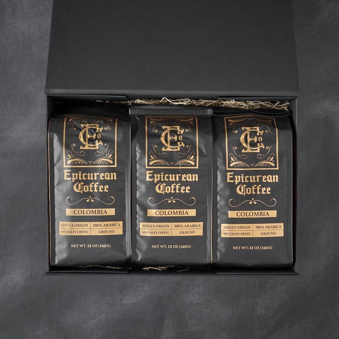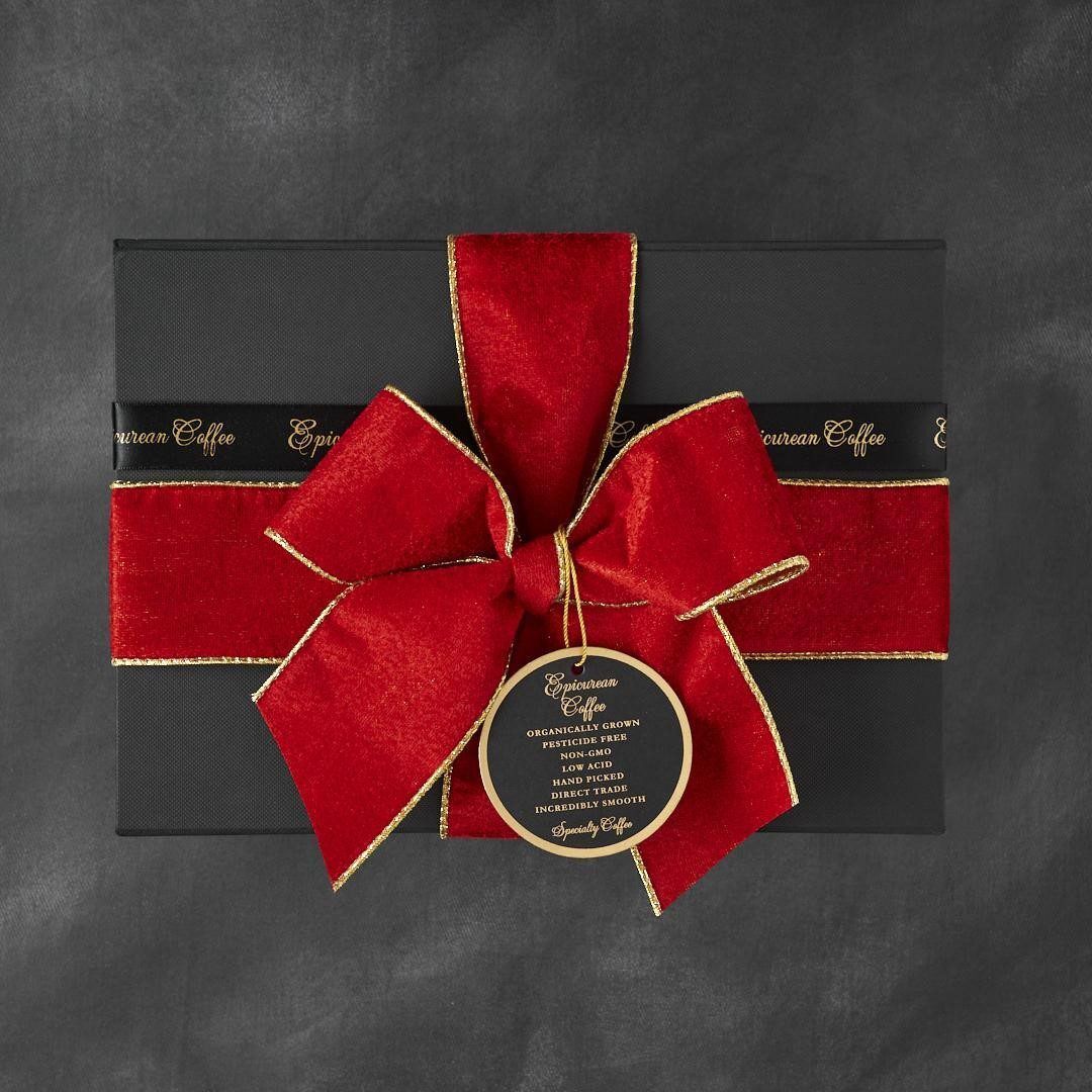 This option features: a black magnetic seal keepsake box, with three 12 oz. bags of organically grown specialty coffee and an Epicurean Coffee Scoop, wrapped with a gorgeous ribbon, and product tag.