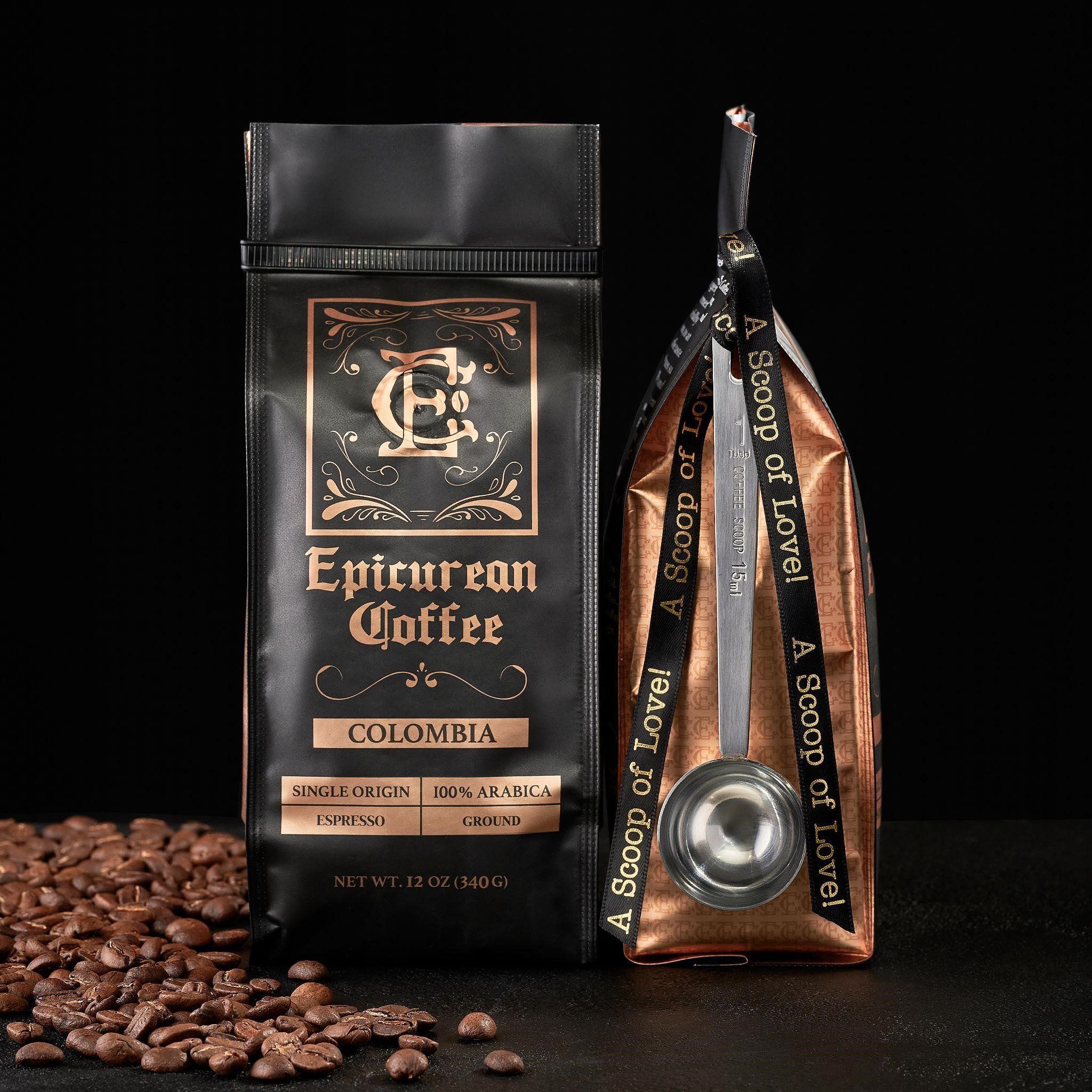 This luxury gift includes: a 12 oz. bag of beautifully roasted specialty coffee, 3 pieces of tissue paper (2 black and 1 white, silver or gold), an Epicurean Coffee Scoop, a black handle bag and a product tag.