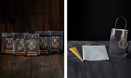This gift includes: two 3.5 oz. coffee bags, and Epicurean Coffee Scoop, a black bag, 3 pieces of tissue (2 black and one white, silver or gold), a black handle bag and a product tag.